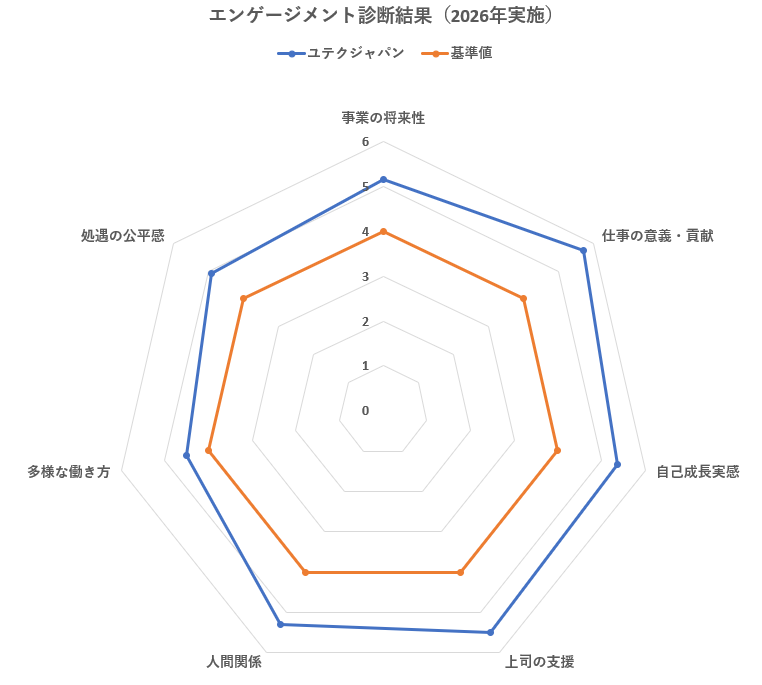 当社では、組織および職場の改善や活性化に役立てる目的で全社員を対象としたエンゲージメント診断を毎年実施しており、全ての調査項目で基準値を上回る結果となっております。特に「仕事の意義・貢献」のスコアが著しく高いのが当社の特徴です。今後もオープンなコミュニケーションが交わせる職場環境を維持し、より働き甲斐のある会社の実現を目指していきます。